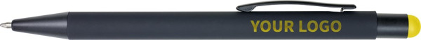 ABS en aluminium balpen, blauwschrijvend, met rubberen coating. De onderlaag van de houder en rubberen stylus top zijn gekleurd. Bij graveren zal het logo dezelfde kleur hebben als de top.