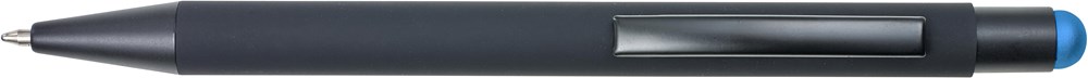 ABS en aluminium balpen, blauwschrijvend, met rubberen coating. De onderlaag van de houder en rubberen stylus top zijn gekleurd. Bij graveren zal het logo dezelfde kleur hebben als de top.