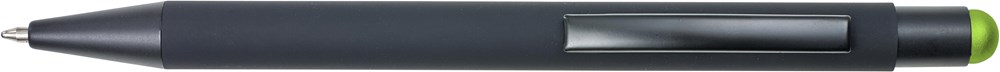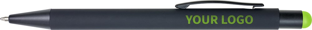 ABS en aluminium balpen, blauwschrijvend, met rubberen coating. De onderlaag van de houder en rubberen stylus top zijn gekleurd. Bij graveren zal het logo dezelfde kleur hebben als de top.