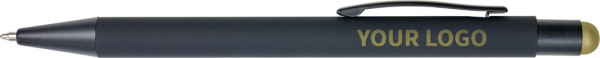 ABS en aluminium balpen, blauwschrijvend, met rubberen coating. De onderlaag van de houder en rubberen stylus top zijn gekleurd. Bij graveren zal het logo dezelfde kleur hebben als de top.
