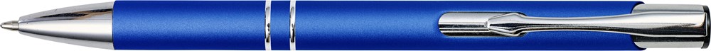 Metalen balpen, blauwschrijvend, met rubber en twee zilverkleurige ringen, clip en tip.