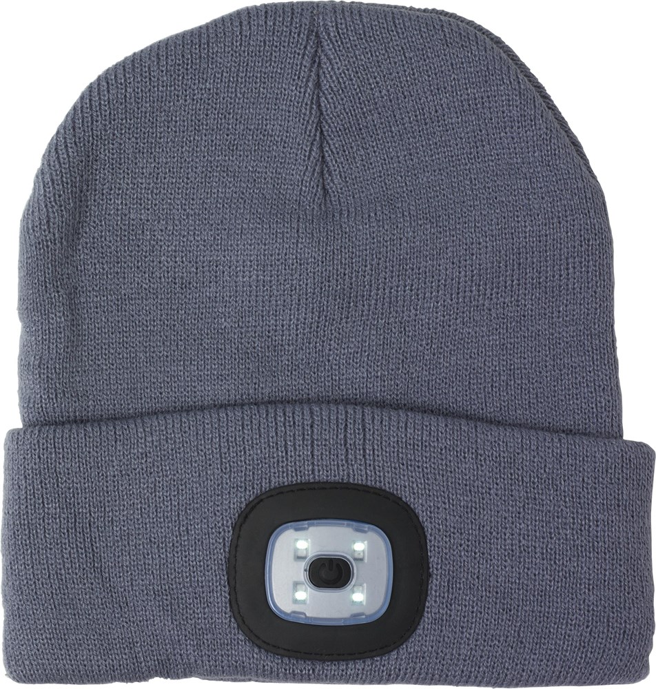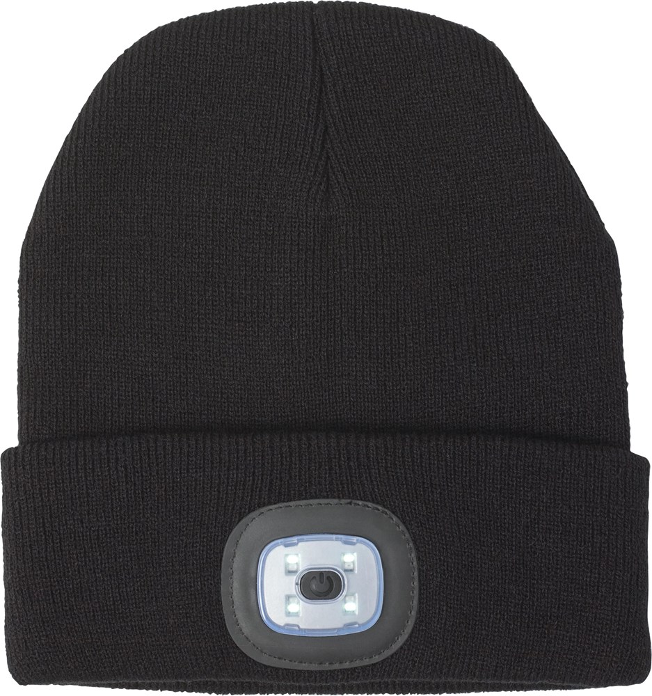 Acryl muts met COB lampje. Verlichting kan verwijderd worden en heeft drie verschillende lichtstanden.