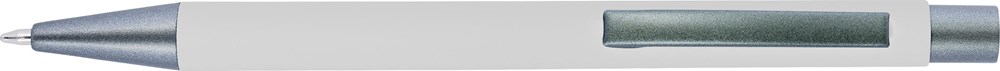 Balpen met rubberen toplaag. De tip, top en clip hebben een donkergrijze kleur. De onderlaag is zichtbaar bij laser graveren. Blauwschrijvend.