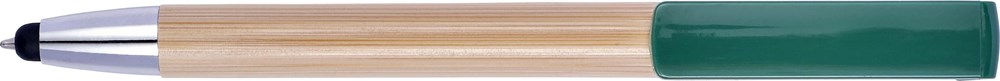 Bamboe balpen, blauwschrijvend, en stylus in één. De houder is gemaakt van bamboe, de tip en clip zijn kunststof. De clip is tevens de drukknop en doet dienst als telefoonstandaard.