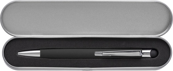 Aluminium balpen, zwartschrijvend, met rubberen coating en rubberen tip voor capacitieve schermen. Inclusief pennendoos.