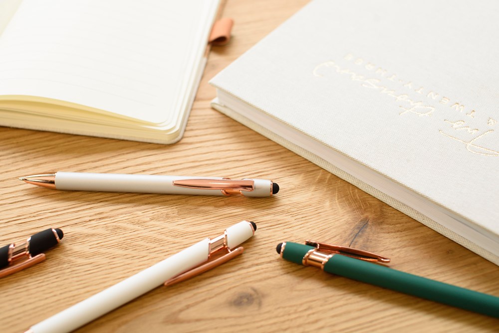Aluminium balpen met roségouden details en stylus. Blauwschrijvend. Bij het graveren zal het ontwerp zilverkleurig zijn.