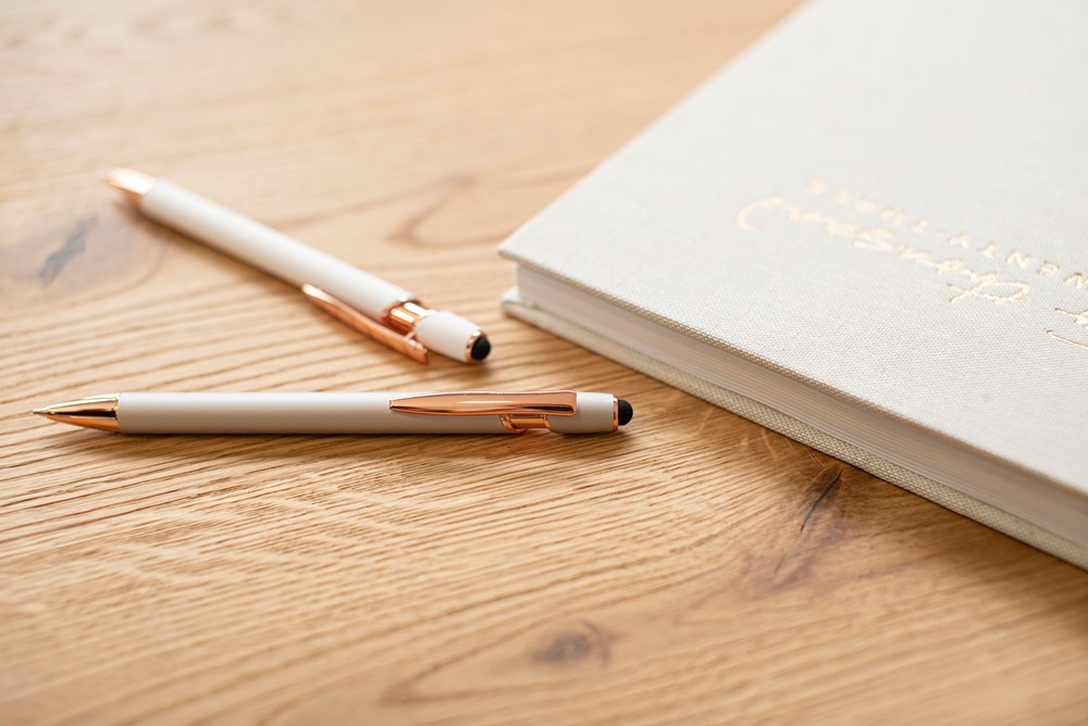 Aluminium balpen met roségouden details en stylus. Blauwschrijvend. Bij het graveren zal het...meer