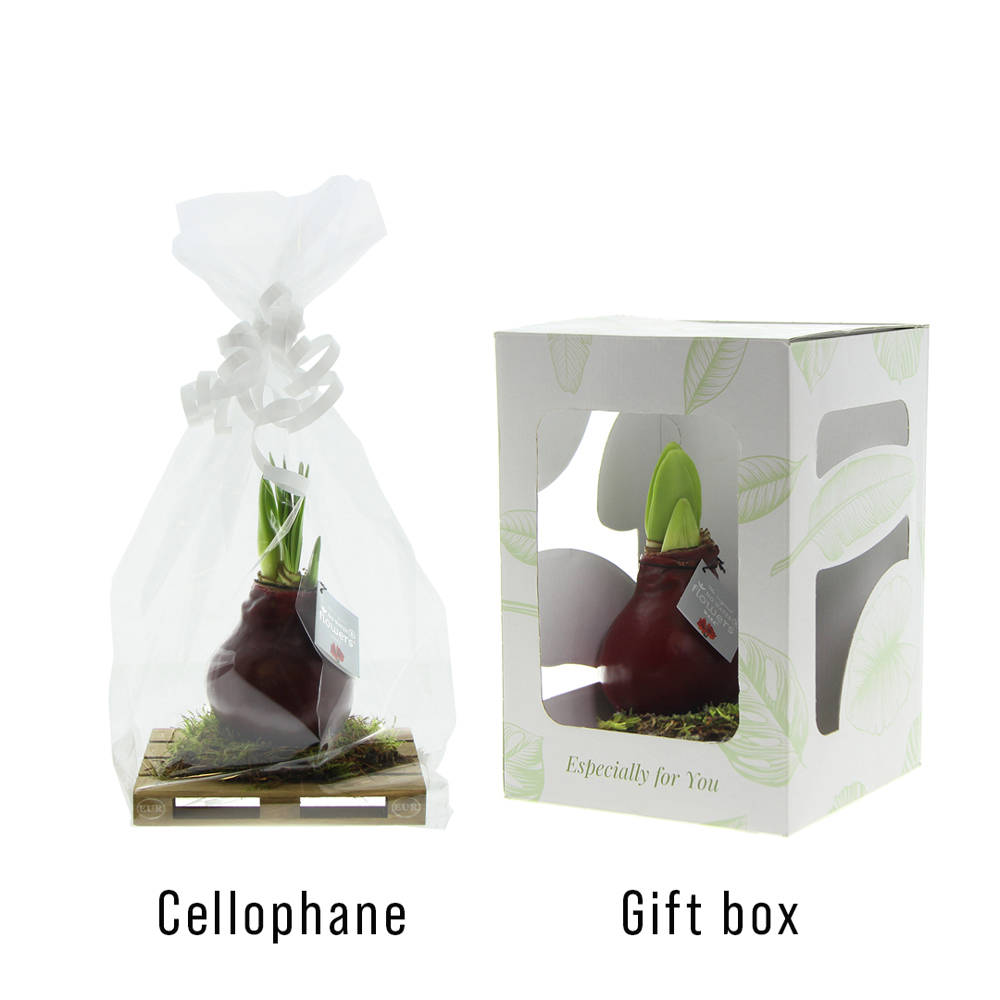 No Water Flowers® zijn een luxe, groeiend en bloeiend geschenk. De levende No Water Flowers® staan bekend om de unieke handgemaakte wax amaryllisbollen. Deze speciaal geselecteerde en geteste amaryllisbollen hebben genoeg energie om zonder water te groeien en te bloeien. Authentieke No Water Flowers® geven vrij korte bloemstelen, vallen niet om en bloeien gegarandeerd. Iedere No Water Flowers® wordt zorgvuldig schoongemaakt en tot in perfectie gewaxt. Dit geeft de bloembol een eigentijdse en modieuze uitstraling. Deze No Water Flowers® is geplaatst op een gaaf mini palletje wat een stoere en gave verschijning is. Super tof voor bijvoorbeeld de logistieke sector. Bovendien zorgt dit ervoor dat de amaryllisbol extra stevig staat.