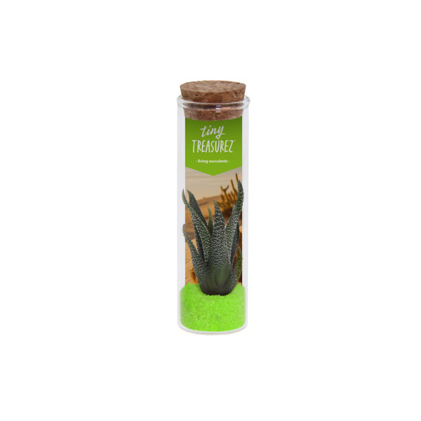 De Tiny Treasurez® Message in a bottle small is een originele groene give-away, perfect als relatiegeschenk tijdens evenementen, beurzen, themadagen of bedankmomenten. In het glazen flesje bevindt zich een laagje zand of gekleurd grind, een sfeerkaartje met informatie over de Tiny Treasurez en natuurlijk de levende mini-succulent. Het standaard kaartje kan desgewenst worden vervangen of gepersonaliseerd met een eigen boodschap. Ook de kurk op de fles kan bedrukt worden.