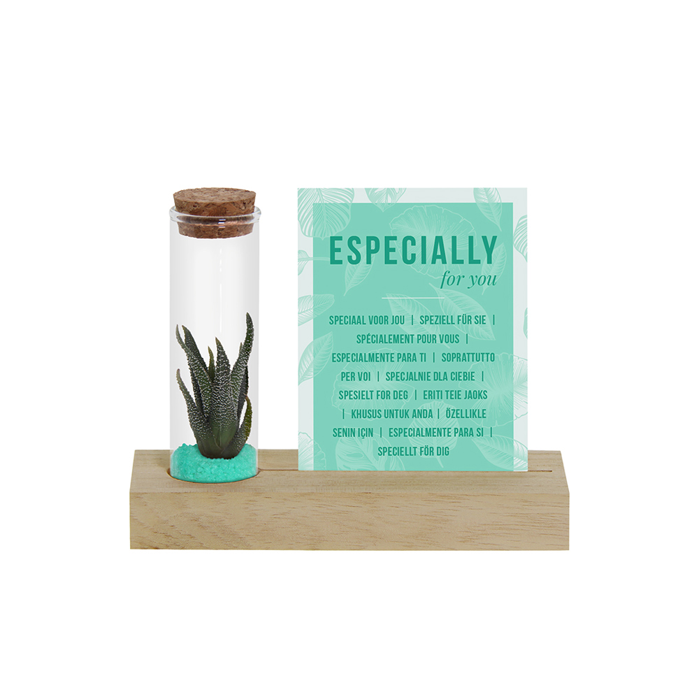 In deze variant staat één glazen flesje met levende mini-succulent stevig op een houten standaard, voorzien van een sleuf voor een los A7-kaartje. Zowel het kaartje als het houten blokje kunnen gepersonaliseerd worden met een logo, boodschap of ontwerp naar wens. Bij dit artikel is het A7-kaartje zoals op de foto standaard inbegrepen. Wil je in plaats daarvan een eigen gepersonaliseerd kaartje in full color toevoegen? Kies dan de personalisatie-optie, je betaalt alleen de opstartkosten voor het bedrukken. Het flesje bevat een laagje zand of gekleurd grind en vormt samen met het kaartje een opvallende en blijvende attentie.