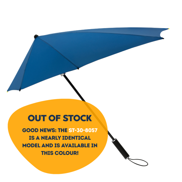 De aërodynamische stormparaplu met de brede achterkant voor maximale bescherming tegen regen..