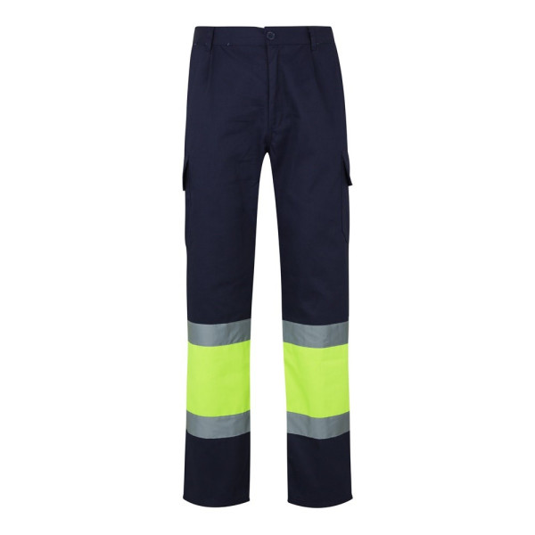 Tweekleurige multi-pocket twill broek (210g/m²), van katoen (20%) en polyester (80%). Met elastische tailleband en reflecterende strepen aan de onderkant van de broek. Bevat zes zakken (2 Franse zakken, 2 zijbalgzakken en 2 achterbalgzakken). Product in overeenstemming met EU-verordening 2016/425, gecertificeerd door EN20471 en klasse Nº 1. Maat: 4XL, 5XL