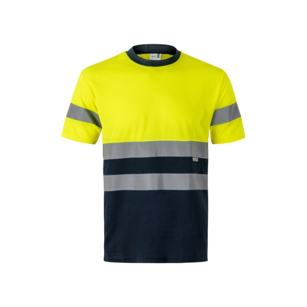 Tweekleurig technisch bird-eye T-shirt (140g/m²) van polyester (100%). Korte mouwen, met geribde ronde hals in contrasterende kleur en reflecterende strepen op de romp en mouwen. Product in overeenstemming met EU-verordening 2016/425, gecertificeerd door EN20471 en klasse Nº 1. Maat: S, M, L, XL, 2XL, 3XL