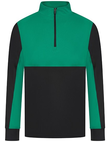 Contrasterende panelen aan de borst en armen | Kwartrits | Zijnaden | Omgekeerde nylon ritsen vooraan in het midden en aan de zijzakken | Mouw met 1×1 ribmanchet | Semi-automatische ritstrekker en -schuiver
