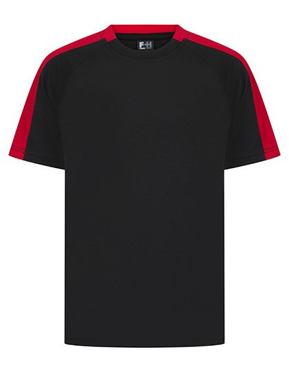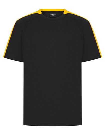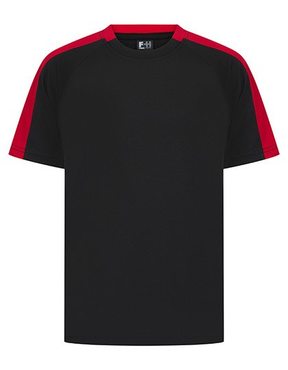 Single jersey | Afvoerende afwerking op stof | 2-delige contrasterende kraag | Ronde halsuitsnijding | Raglan mouw | Contrasterende zijpanelen uit dezelfde stof op de mouw | Afscheurbaar label
