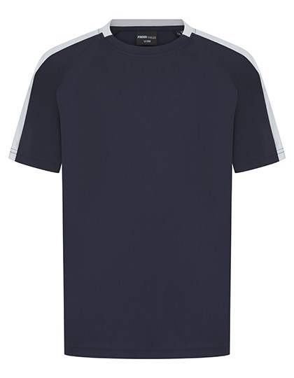 Single jersey | Afvoerende afwerking op stof | 2-delige contrasterende kraag | Ronde halsuitsnijding | Raglan mouw | Contrasterende zijpanelen uit dezelfde stof op de mouw | Afscheurbaar label