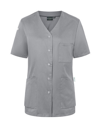 Twillstof: 65% (gerecycleerd) polyester / 35% katoen, 150 g/m² | Kleurvast, gemakkelijk te onderhouden, duurzaam | Moderne, duurzame damestuniek met korte mouwen en V-hals | Polyester inhoud gemaakt van gerecycleerd plastic | Bijzonder licht materiaal voor aangenaam draagcomfort tijdens dagelijkse werkzaamheden | Zeer hoge wasbaarheid op 95°C zorgt voor uitzonderlijke netheid | licht op maat | Twee opgestikte zijzakken met verborgen binnenzak aan de rechterkant | Een lus in de zijzak om een sleutelhanger te bevestigen | Opgestikte borstzak aan de linkerkant met pennenvak | Vijf drukknopen in het midden om de tuniek te sluiten | Het product bevat 65% gerecycleerd polyester en is geproduceerd op milieuvriendelijke en sociaal verantwoorde wijze.