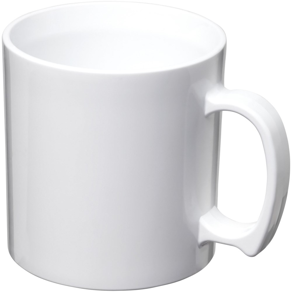 Duurzame, enkelwandige kunststof mok. Volume 300 ml. Gemaakt in het Verenigd Koninkrijk.meer