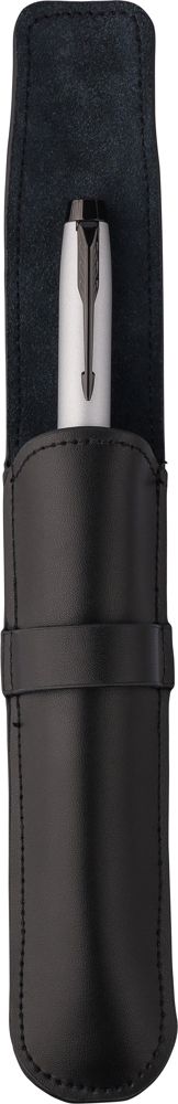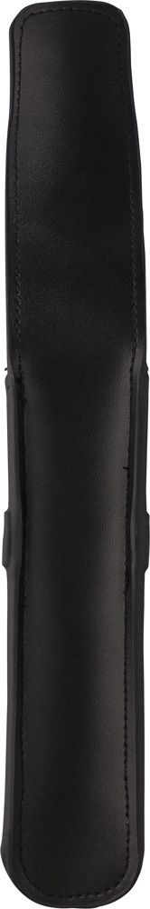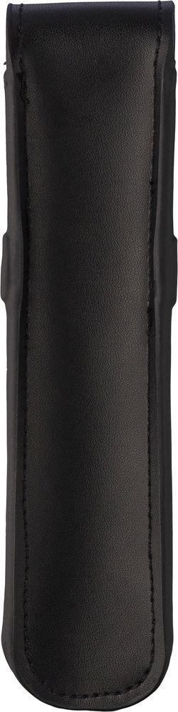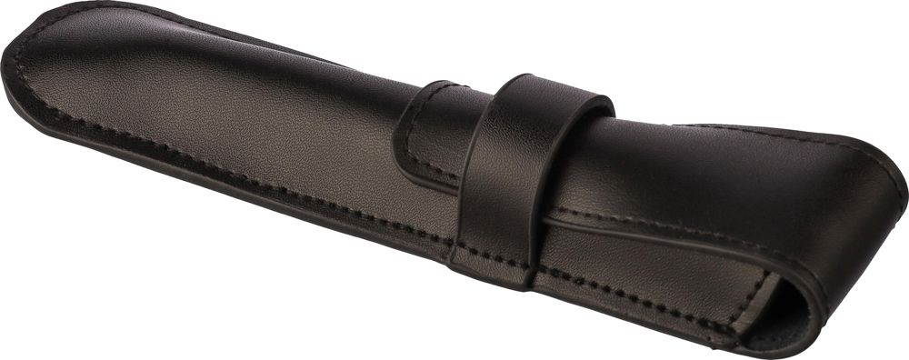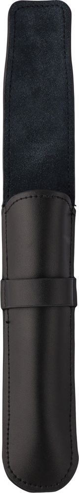 Leren (twee­lagige) pennenetui met klep en riemsluiting. Voorzien van zachte fluwelen binnenzijde. Individueel verpakt in een zwarte kartonnen hoes. Runderleer.