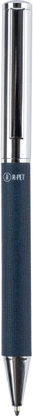 Messing en rPET draaibalpen met metalen clip en grip. Voorzien van draaimechanisme en rPET-logo op het lichaam. Individueel verpakt in een bruine kartonnen doos. Blauwe inkt.