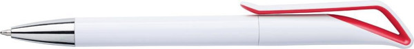 Kunststof balpen met gekleurde elementen, blauwschrijvend, met de clip in de vorm van een geometrische zwanenhals, met draaimechanisme.