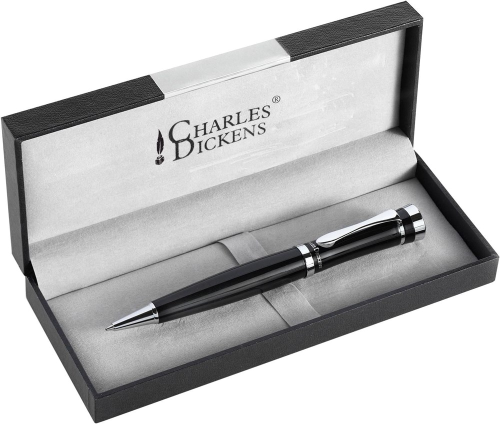 Metalen Charles Dickens® balpen met draaimechanisme, zwartschrijvend, in een luxe cassette.