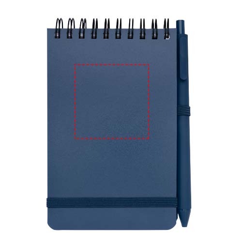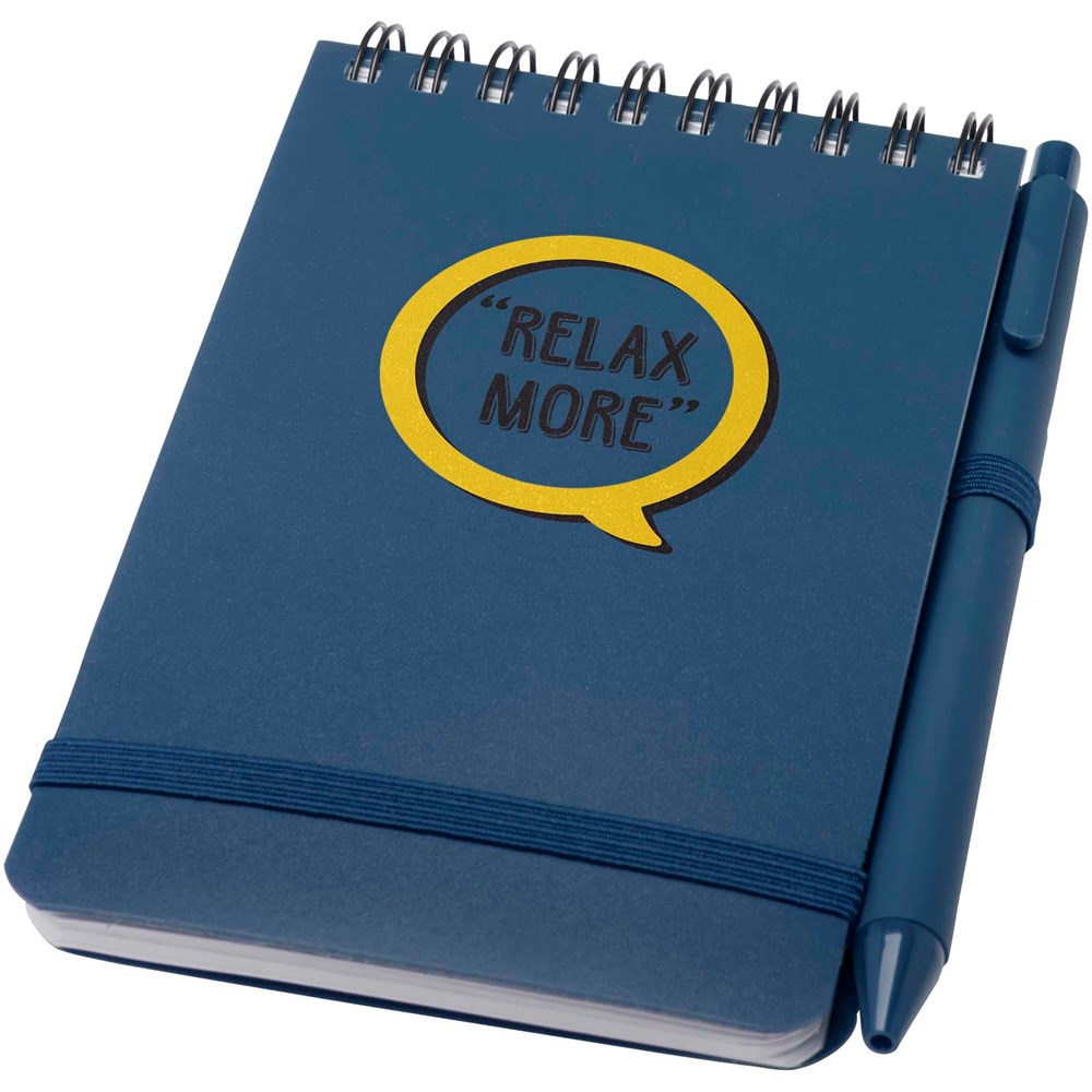 Het Thalaasa A6 notitieboek met harde kaft is gemaakt van ocean-bound plastic en heeft 80 gelinieerde vellen crèmekleurig papier van 70 g/m². Het notitieboek heeft afgeronde hoeken, een elastische sluiting en een pennenlus. De balpen met zwarte inkt is ook gemaakt van gerecycled plastic uit de oceaan. Schrijflengte: 1000 meter. Stiftmaat: 1,0 mm.