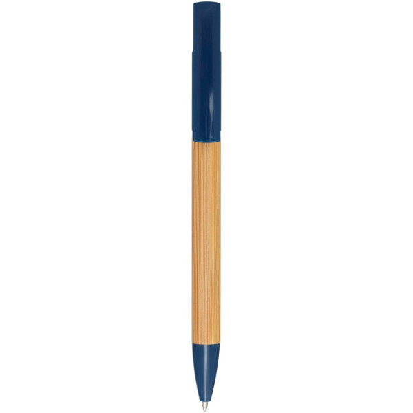 Bamboe balpen die ook dienst doet als telefoonhouder. De knop en middenring zijn gemaakt van gerecycled plastic, de punt is gemaakt van messing en de houder is gemaakt van verantwoord gewonnen bamboe. Inktkleur: zwart. Schrijflengte: 1000 meter. Stiftmaat: 1,0 mm.