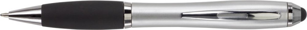 Multifunctionele kunststof balpen, zwartschrijvend, met zwart rubberen grip en gekleurde houder. Ook te gebruiken als capacitieve pen voor uw 'touch screen' schermen.