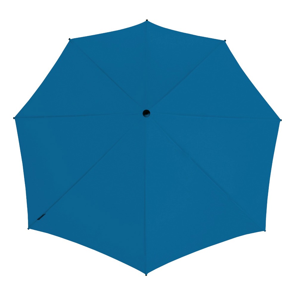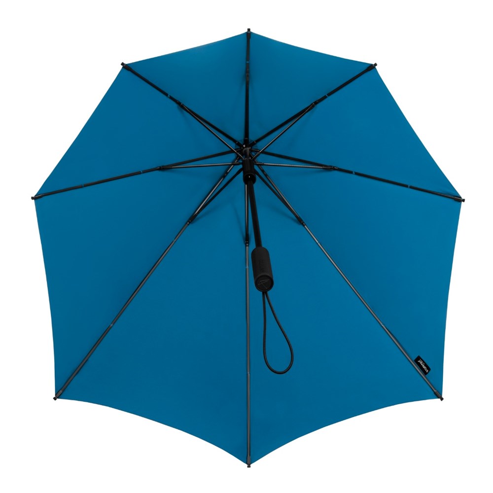 De aërodynamische stormparaplu met de brede achterkant voor maximale bescherming tegen regen..