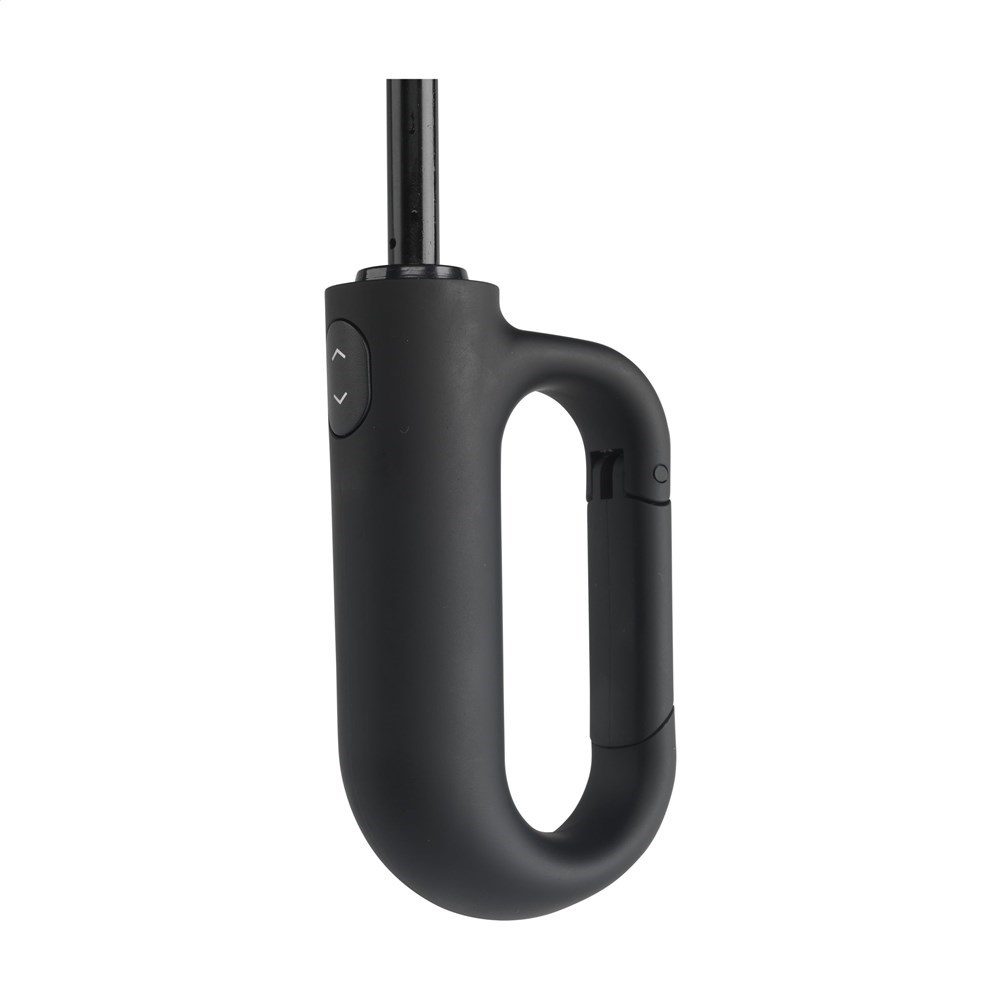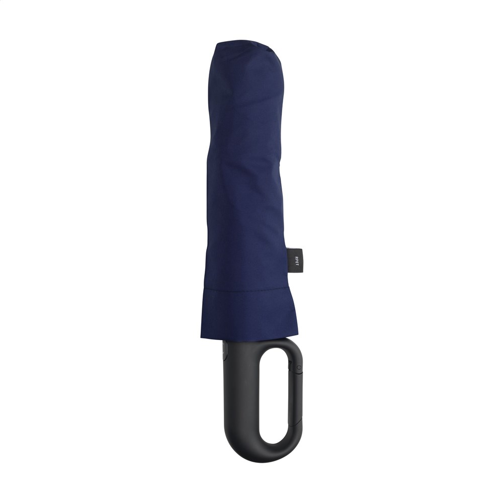 Volautomatische in- en uitklapbare paraplu met 190T RPET pongee polyester bespanning en een comfortabele kunststof handgreep in de vorm van een karabijnhaak. Hiermee kan de paraplu eenvoudig worden opgehangen aan bijvoorbeeld een (rug)tas. Met een schermdoorsnede van 97 cm, metalen steel, glasvezel frame, klittenbandsluiting en opberghoes. Afm. dichtgevouwen: 7 x 6 x 33 cm. RCS-gecertificiceerd. Totaal gereycled materiaal: 15%.