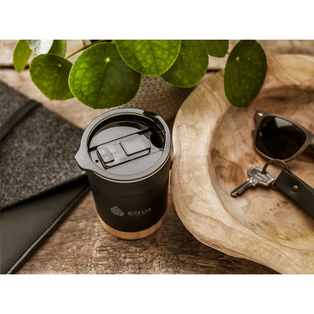 Dubbelwandige thermosbeker met een buitenwand van gerecycled RVS en PP binnenwand. De beker heeft een zwart transparante push-on deksel met afsluitbare drinkopening. Een opvallend mooi detail is de bamboe onderzijde met een dikte van 1,5 cm. Niet vaatwasserbestendig. RCS-gecertificeerd. Totaal gerecycled materiaal: 38%. Inhoud 350 ml. RVS kan oneindig vaak gerecycled worden terwijl de kwaliteit van het materiaal behouden blijft. Door het gebruik van gerecycled RVS worden minder nieuwe grondstoffen gebruikt. Dit betekent minder energieverbruik, minder gebruik van water en reductie van de CO2-uitstoot. Per stuk verpakt.