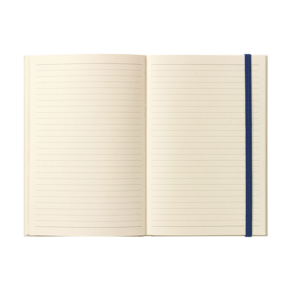 Exclusief notitieboek in A5-formaat, gemaakt van het gerecycled afval van de suikerrietplant. Met hardcover, 80 vel/160 pagina's gelinieerd papier (100 g/m²) en sluitelastiek. De cover en het papier zijn FSC® gecertificeerd. Het papier, waarin kleine vezels zichtbaar zijn, heeft een mooie lichtbruine kleur. Dit benadrukt het gebruik van natuurlijke materialen. Na de oogst van de suikerrietplant blijven de wortels van de plant in de grond en worden de stengels en bladeren verwerkt tot een residu dat gebruikt wordt voor het maken van papier. Een suikerrietplant haalt tijdens de groei CO2 uit de lucht en kan wel tot 10 jaar oud worden.