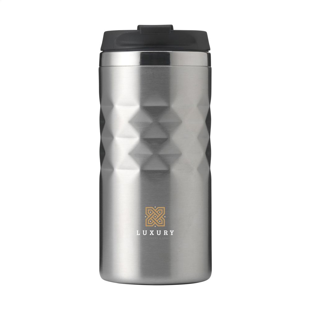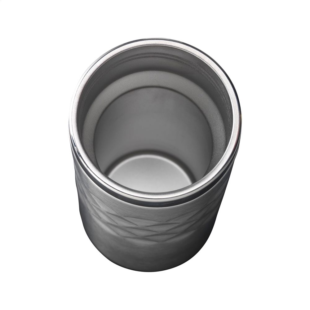 Dubbelwandige thermosbeker gemaakt van gerecycled RVS. Met schroefdeksel en klikopening. De beker heeft een opvallend 3D-geometrisch diamantpatroon in de houder. Slipvaste onderzijde. Niet vaatwasserbestendig. RCS-gecertificeerd. Totaal gerecycled materiaal: 74%. Inhoud 280 ml. RVS kan vele malen gerecycled worden terwijl de kwaliteit van het materiaal grotendeels behouden blijft. Door het gebruik van gerecycled RVS worden minder nieuwe grondstoffen gebruikt. Dit betekent minder energieverbruik en minder gebruik van water. Per stuk verpakt.