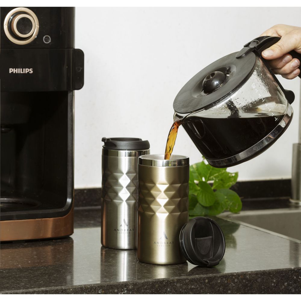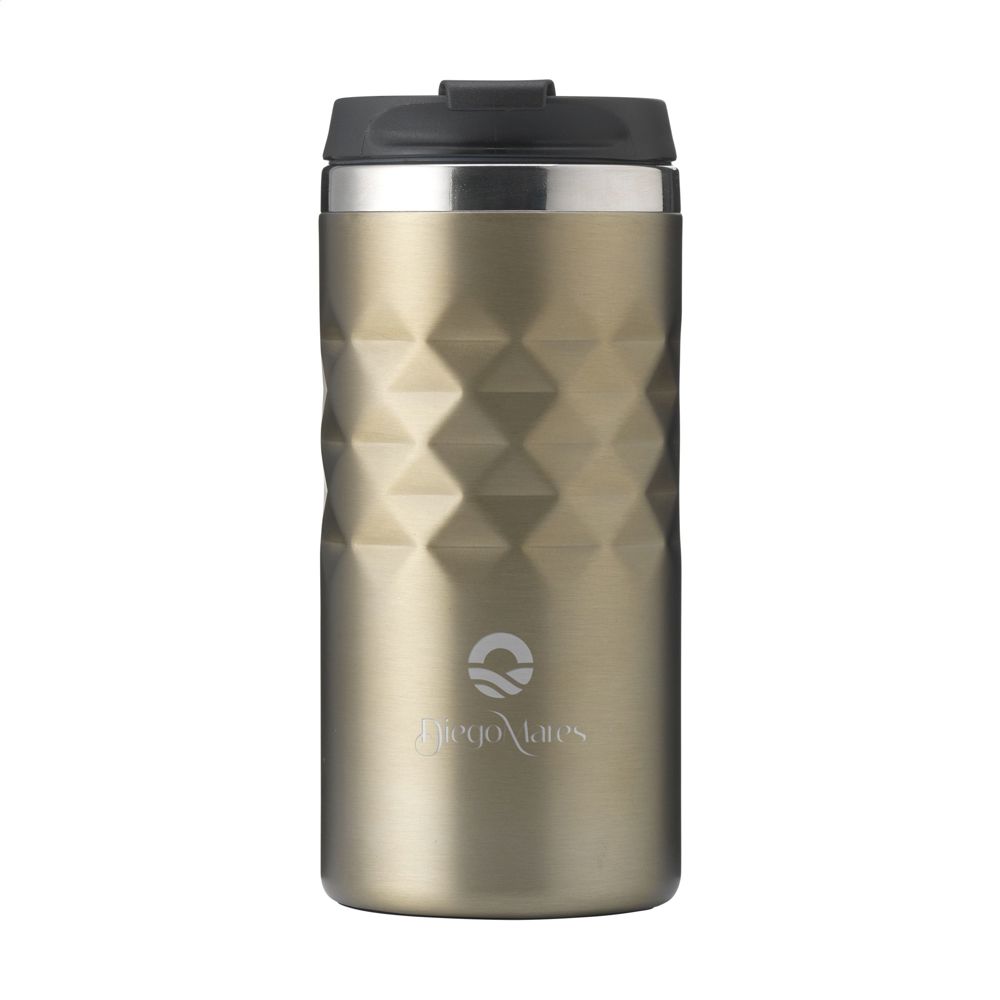 Dubbelwandige thermosbeker gemaakt van gerecycled RVS. Met schroefdeksel en klikopening. De beker heeft een opvallend 3D-geometrisch diamantpatroon in de houder. Slipvaste onderzijde. Niet vaatwasserbestendig. RCS-gecertificeerd. Totaal gerecycled materiaal: 74%. Inhoud 280 ml. RVS kan vele malen gerecycled worden terwijl de kwaliteit van het materiaal grotendeels behouden blijft. Door het gebruik van gerecycled RVS worden minder nieuwe grondstoffen gebruikt. Dit betekent minder energieverbruik en minder gebruik van water. Per stuk verpakt.