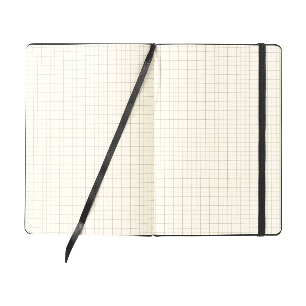 Notitieboek in A5-formaat met ca. 96 vel/192 pagina's crèmekleurig, FSC Mix gecertificeerd ruitjespapier (70 g/m²). Met gebonden rug, harde kaft, sluitelastiek en polyester leeslint. Het geruite papier (5 x 5 mm) is ideaal voor het maken van berekeningen, het tekenen van grafieken en ontwerpen en het ordenen van informatie.