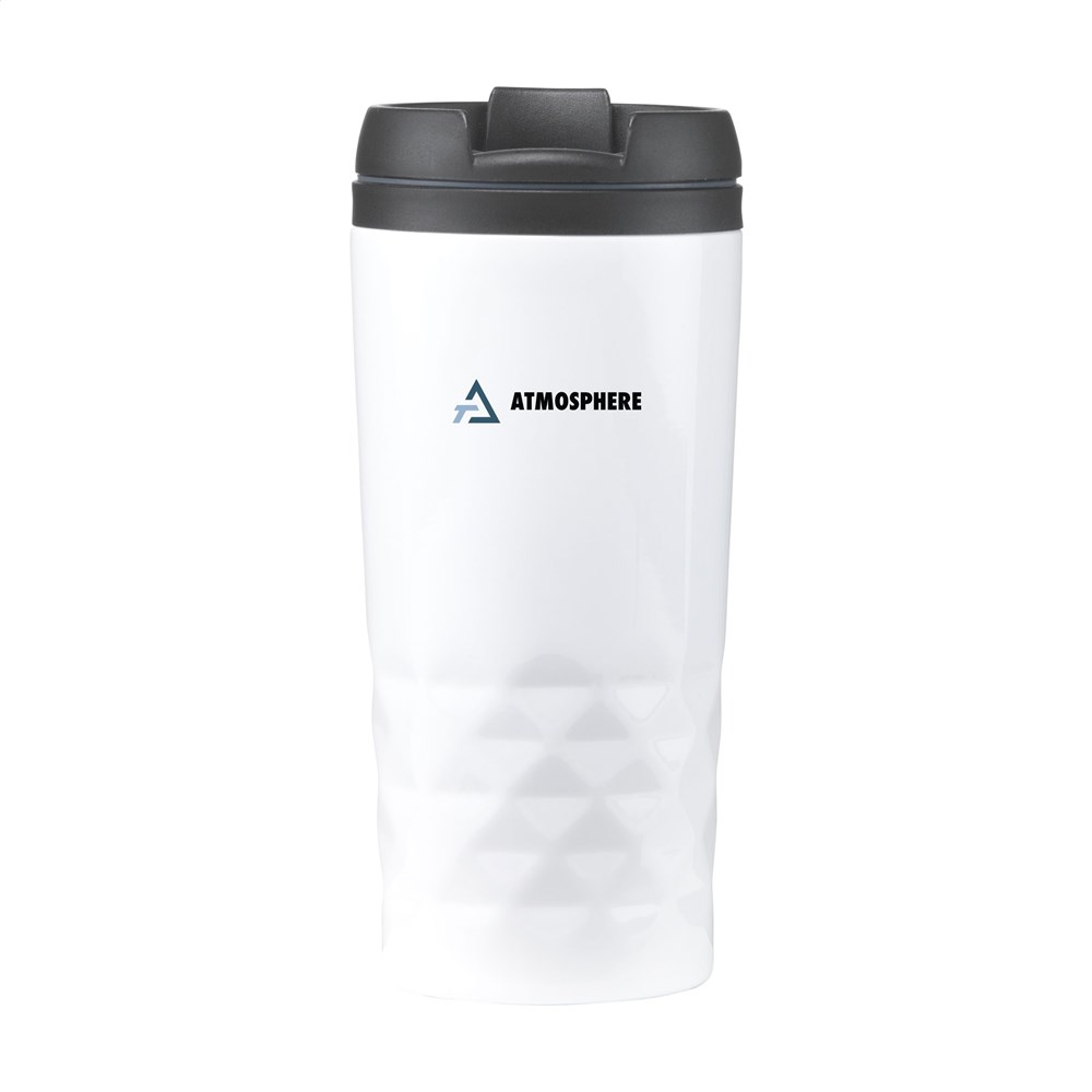 Dubbelwandige RVS thermosbeker met schroefdeksel en klikopening. PP binnenwand. Met opvallend 3D-geometrisch diamantpatroon in de houder. Slipvaste onderzijde. Niet vaatwasserbestendig. Inhoud 300 ml. Per stuk verpakt.
