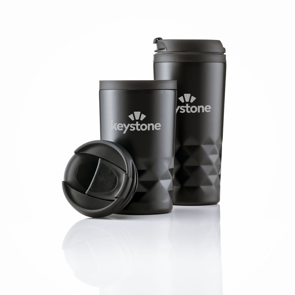 Dubbelwandige RVS thermosbeker met schroefdeksel en klikopening. PP binnenwand. Met opvallend 3D-geometrisch diamantpatroon in de houder. Slipvaste onderzijde. Niet vaatwasserbestendig. Inhoud 300 ml. Per stuk verpakt.