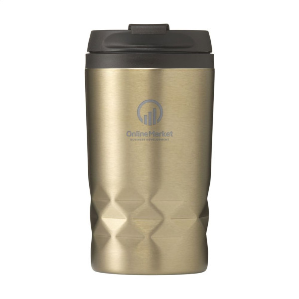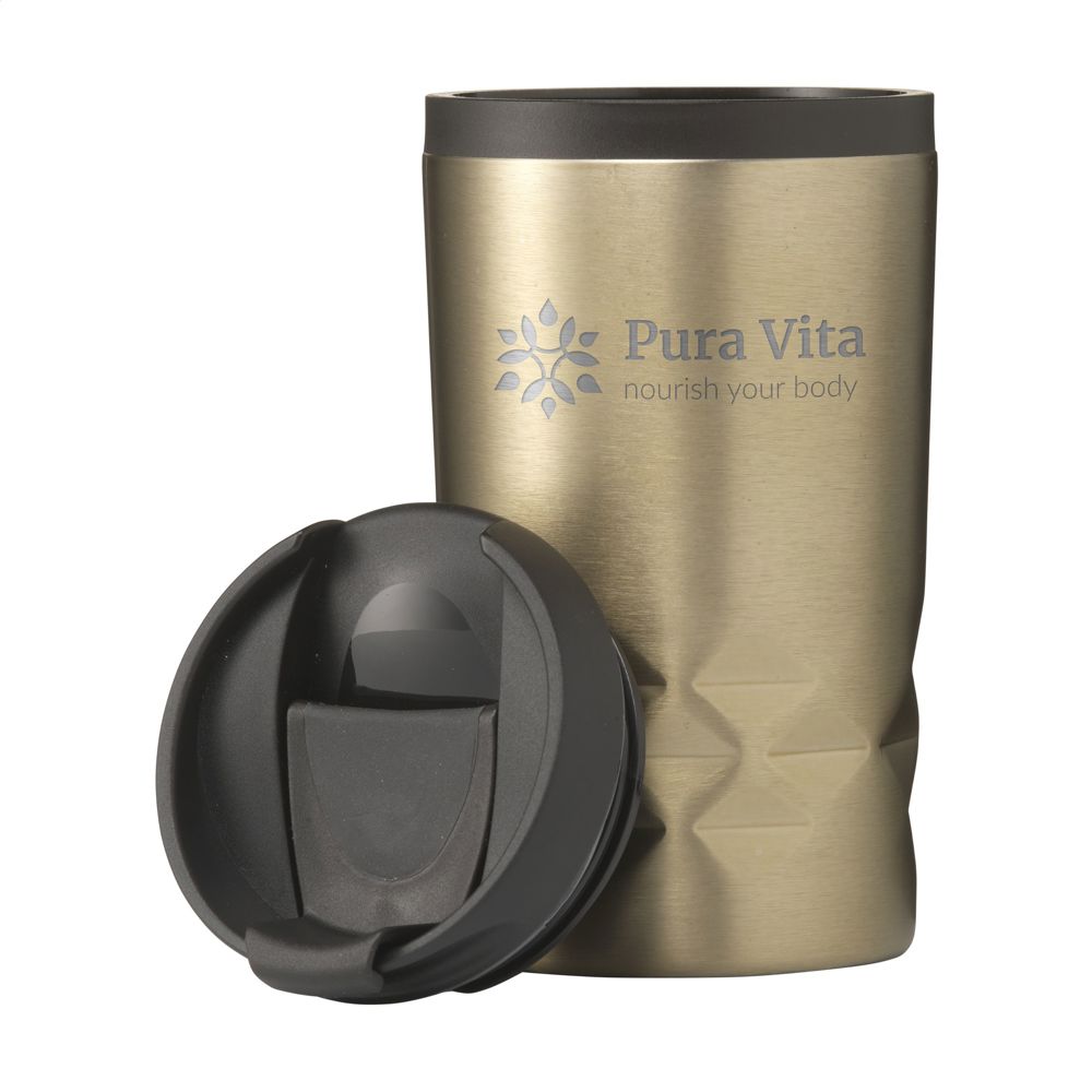 Dubbelwandigethermosbeker gemaakt van gerecycled RVS. Met een kunststof binnenwand, schroefdeksel en klikopening. De beker heeft een opvallend 3D-geometrisch diamantpatroon in de houder. Slipvaste onderzijde. Niet vaatwasserbestendig. Zonder deksel heeft de beker een hoogte van 12,4 cm en daarmee past hij onder nagegoeg alle koffieapparaten. RCS-gecertificeerd. Totaal gerecycled materiaal: 47%. Inhoud 250 ml. RVS kan vele malen gerecycled worden terwijl de kwaliteit van het materiaal grotendeels behouden blijft. Door het gebruik van gerecycled RVS worden minder nieuwe grondstoffen gebruikt. Dit betekent minder energieverbruik en minder gebruik van water. Per stuk verpakt.