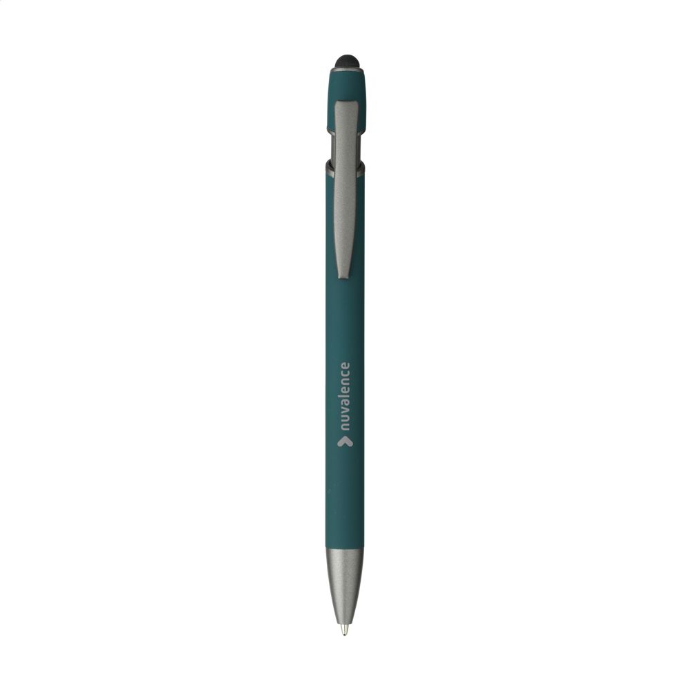 Blauwschrijvende balpen met houder van gerecycled aluminium. De houder is voorzien van een rubberised soft touch finish en een rubberen top/pointer voor het bedienen van touch screens. Met metalen clip. RCS-gecertificeerd. Totaal gerecycled materiaal: 94%. Door het gebruik van gerecycled aluminium worden er minder nieuwe grondstoffen gebruikt tijdens de productie van dit product. Dit betekent minder energieverbruik en minder gebruik van water.