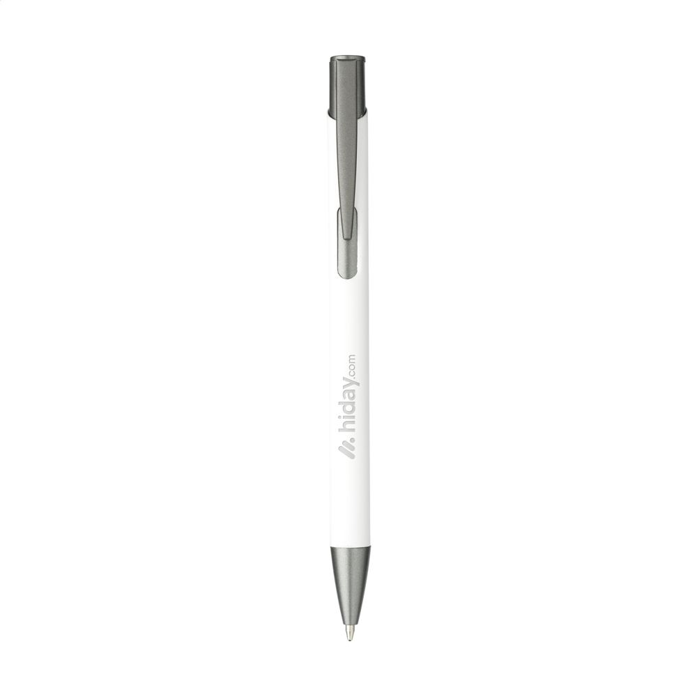 Blauwschrijvende balpen met een houder van gerecycled aluminium. De houder is voorzien van een rubberised soft touch finish. Met stevige metalen clip/drukknop en kunststof puntstuk. Met metalen clip/drukknop. RCS-gecertificeerd. Totaal gerecycled materiaal: 94%. Door het gebruik van gerecycled aluminium worden er minder nieuwe grondstoffen gebruikt tijdens de productie van dit product. Dit betekent minder energieverbruik en minder gebruik van water.