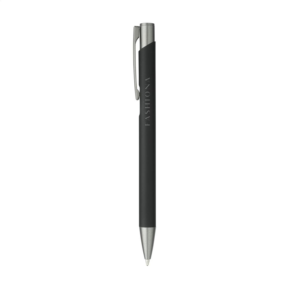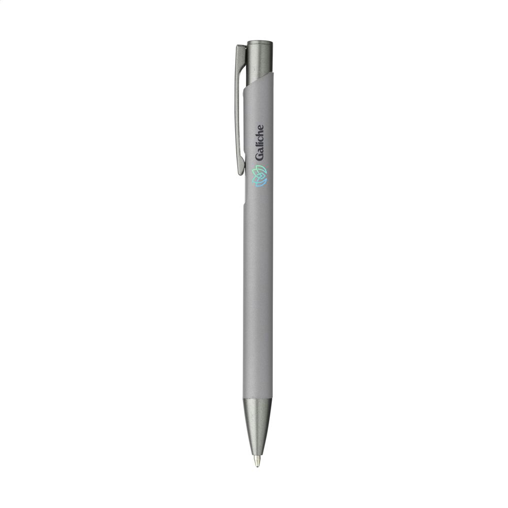 Blauwschrijvende balpen met een houder van gerecycled aluminium. De houder is voorzien van een rubberised soft touch finish. Met stevige metalen clip/drukknop en kunststof puntstuk. Met metalen clip/drukknop. RCS-gecertificeerd. Totaal gerecycled materiaal: 94%. Door het gebruik van gerecycled aluminium worden er minder nieuwe grondstoffen gebruikt tijdens de productie van dit product. Dit betekent minder energieverbruik en minder gebruik van water.
