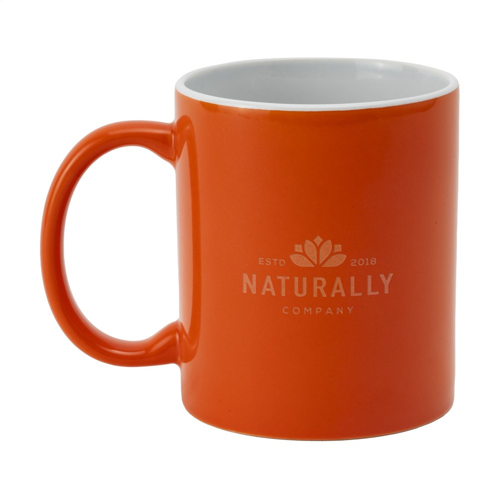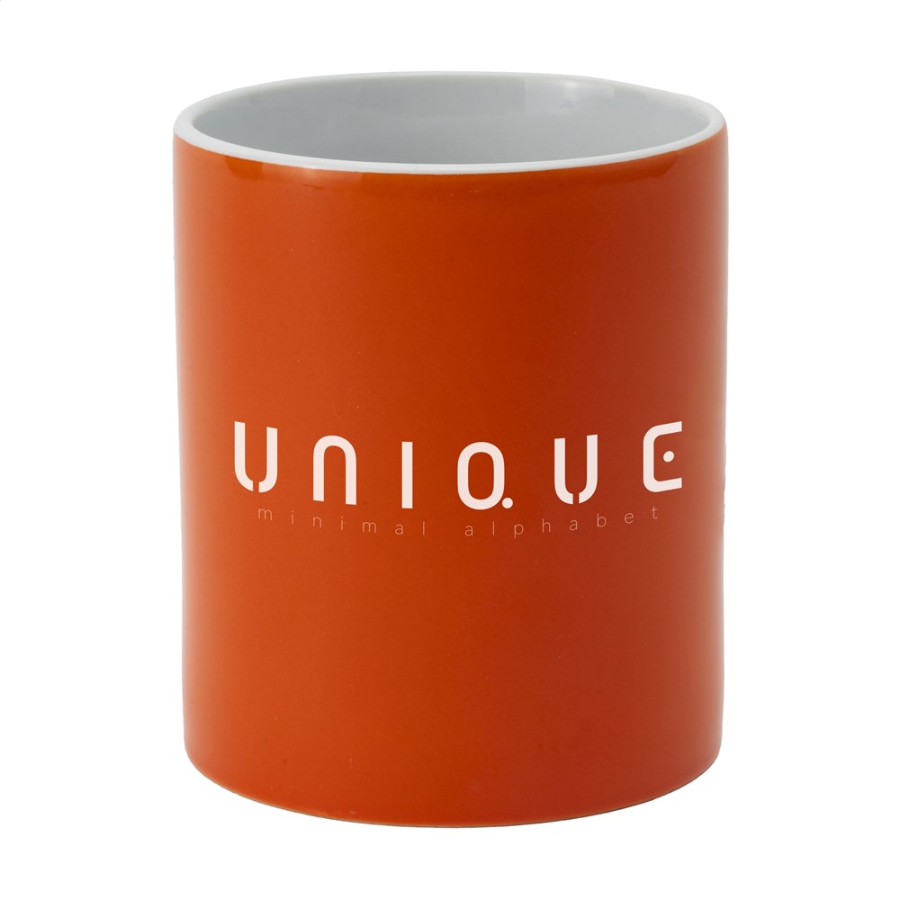 Mok van hoogwaardig keramiek. In geheel wit óf met gekleurde buitenzijde. Vaatwasserbestendig. De opdruk is vaatwasmachine getest en gecertificeerd: EN 12875-2. Inhoud 350 ml.