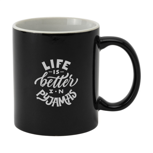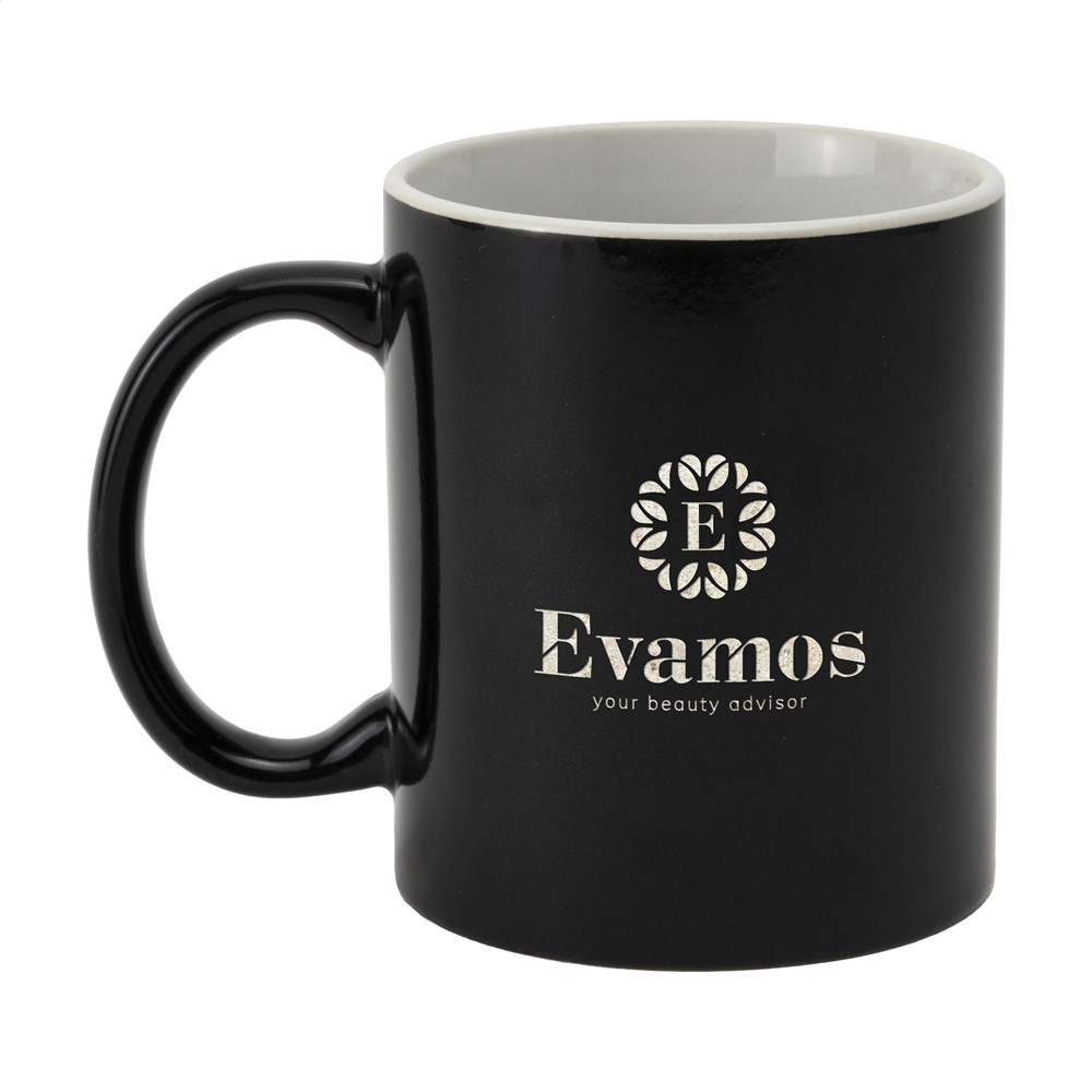 Mok van hoogwaardig keramiek. In geheel wit óf met gekleurde buitenzijde. Vaatwasserbestendig. De opdruk is vaatwasmachine getest en gecertificeerd: EN 12875-2. Inhoud 350 ml.