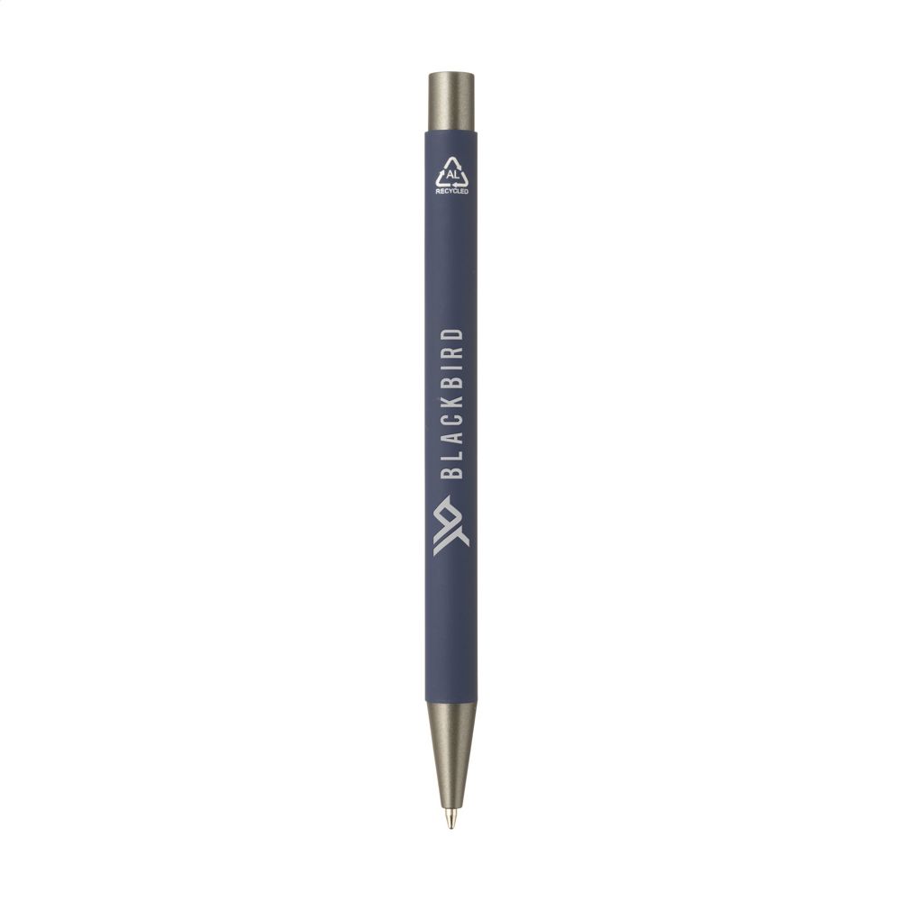 Blauwschrijvende balpen met een houder van 100% GRS-gecertificeerd gerecycled aluminium. De houder is afgewerkt met een rubberised soft touch finish. Het eenvoudige design zonder clip geeft de pen een moderne, elegante uitstraling. RCS-gecertificeerd. Totaal gerecycled materiaal: 81%. Door het gebruik van gerecycled aluminium worden er minder nieuwe grondstoffen gebruikt tijdens de productie van dit product. Dit betekent minder energieverbruik en minder gebruik van water.