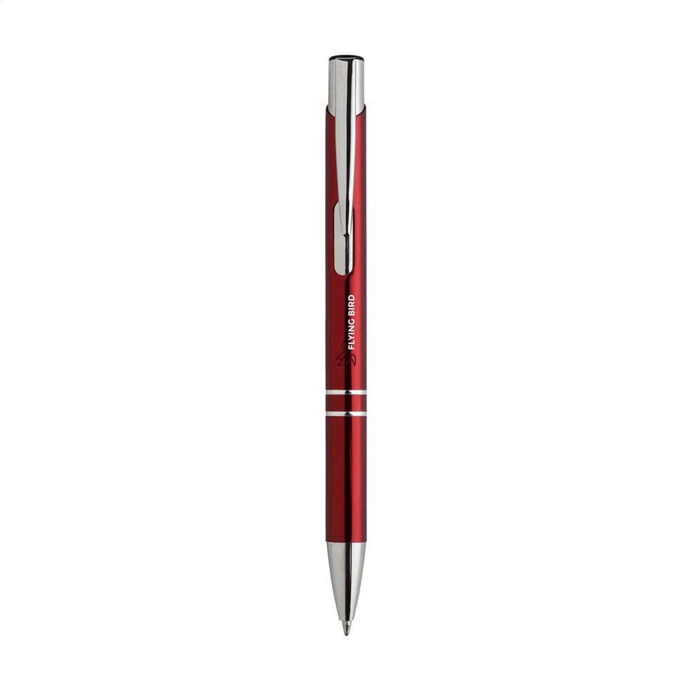 Blauwschrijvende, aluminium balpen met glanzende, metallic look houder en metalen clip.meer