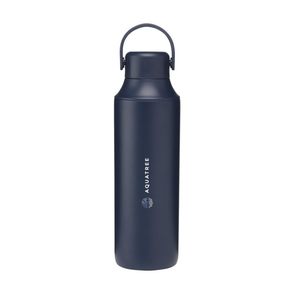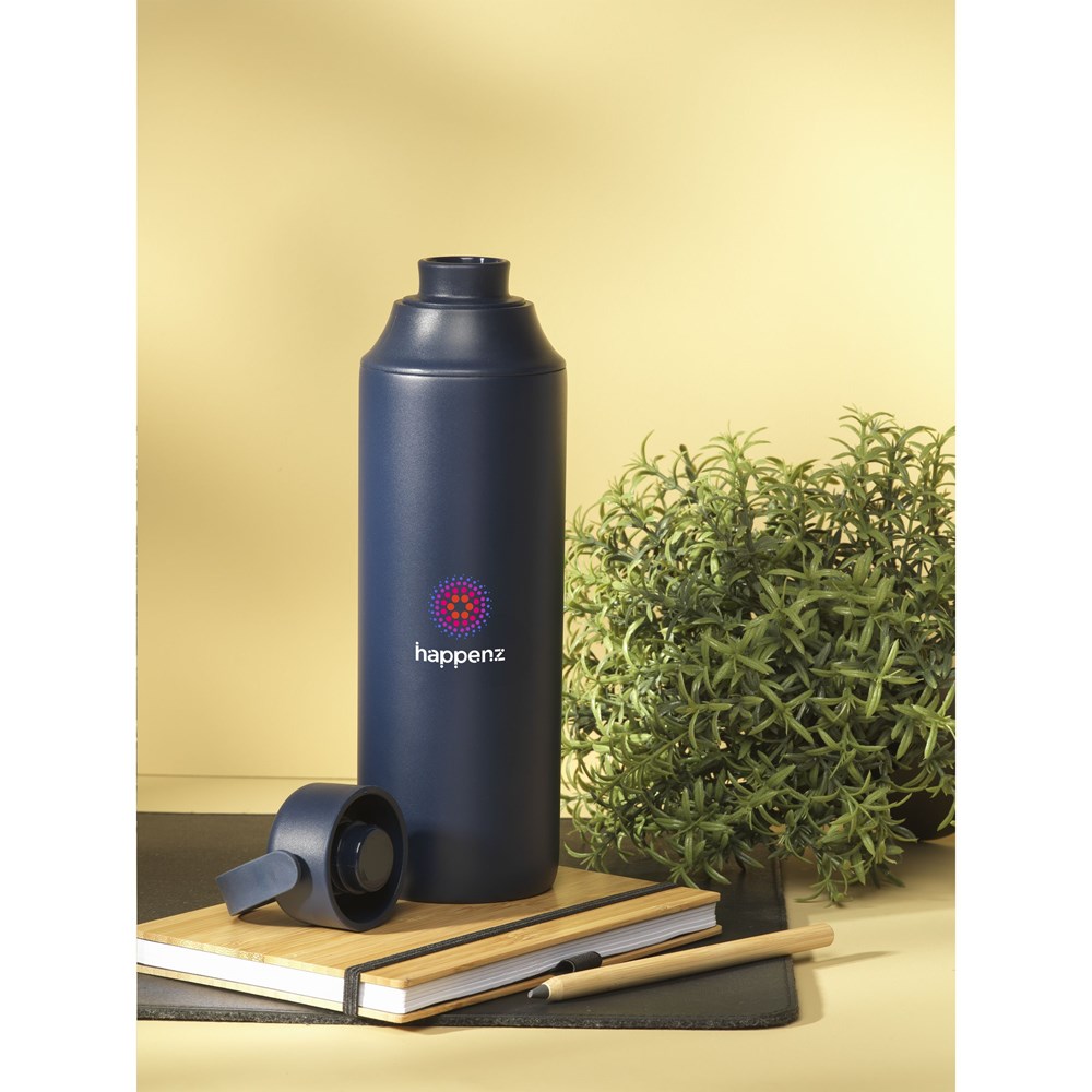 Dubbelwandige thermosfles van gerecycled roestvrij staal. De lekvrije fles heeft een siliconen draaglus en 2 openingen met schroefdop: een drinkopening en een royale opening voor het gemakkelijk reinigen van de fles of het toevoegen van ijsblokjes. Past in de meeste bekerhouders en is afgewerkt met een mooie poedercoating. Geschikt voor het op temperatuur houden van warme of koude dranken. Niet vaatwasserbestendig. RCS-gecertificeerd. Totaal gerecycled materiaal: 72%. Inhoud 600 ml. RVS kan vele malen gerecycled worden terwijl de kwaliteit van het materiaal grotendeels behouden blijft. Door het gebruik van gerecycled RVS worden minder nieuwe grondstoffen gebruikt. Dit betekent minder energieverbruik en minder gebruik van water. Per stuk verpakt.