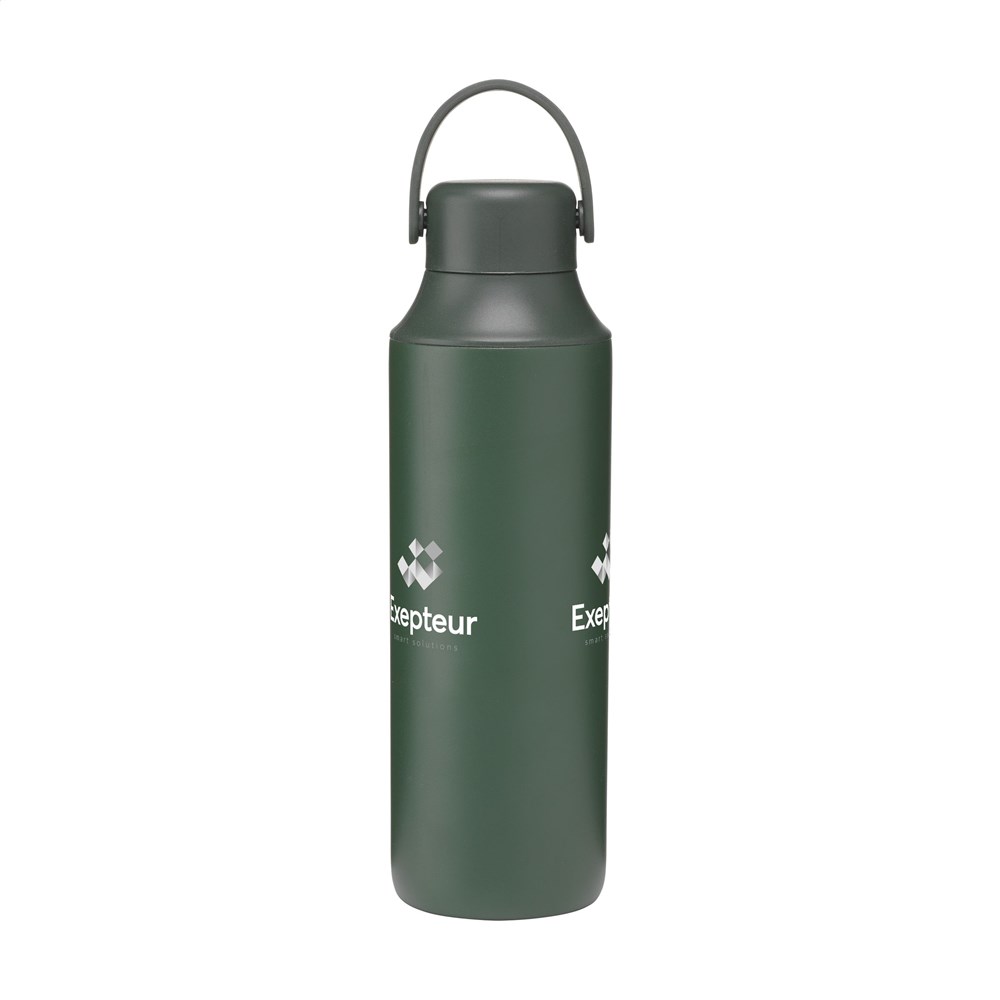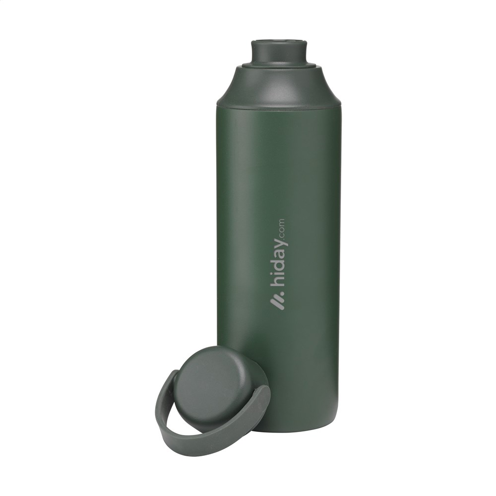 Dubbelwandige thermosfles van gerecycled roestvrij staal. De lekvrije fles heeft een siliconen draaglus en 2 openingen met schroefdop: een drinkopening en een royale opening voor het gemakkelijk reinigen van de fles of het toevoegen van ijsblokjes. Past in de meeste bekerhouders en is afgewerkt met een mooie poedercoating. Geschikt voor het op temperatuur houden van warme of koude dranken. Niet vaatwasserbestendig. RCS-gecertificeerd. Totaal gerecycled materiaal: 72%. Inhoud 600 ml. RVS kan vele malen gerecycled worden terwijl de kwaliteit van het materiaal grotendeels behouden blijft. Door het gebruik van gerecycled RVS worden minder nieuwe grondstoffen gebruikt. Dit betekent minder energieverbruik en minder gebruik van water. Per stuk verpakt.