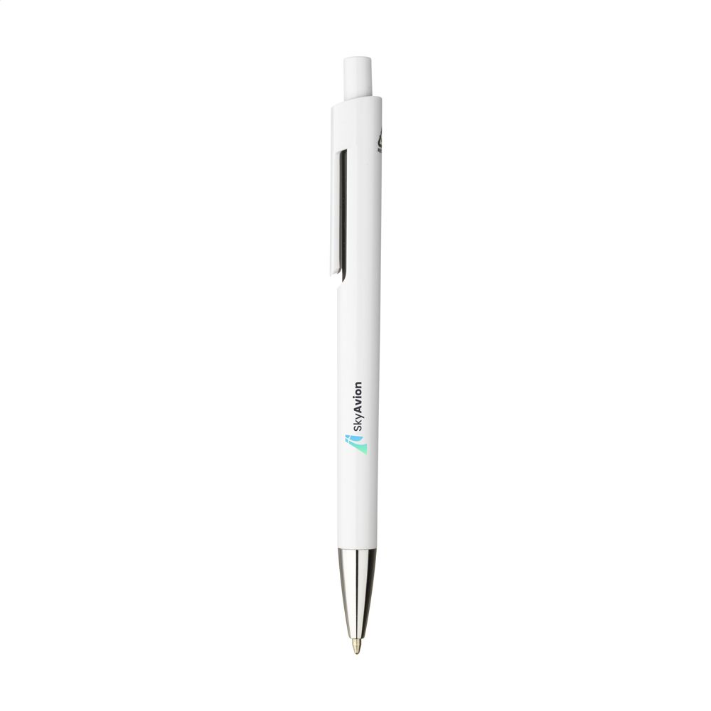 Blauwschrijvende balpen met een houder van 100% gerecycled ABS. Met uniek design: de body en clip van deze balpen zijn uit één geheel vormgegeven en dat maakt deze pen tot een bijzondere eyecatcher. Met opvallend kleuraccent onder de optisch 'zwevende' clip. GRS-gecertificeerd.