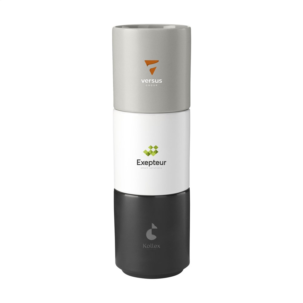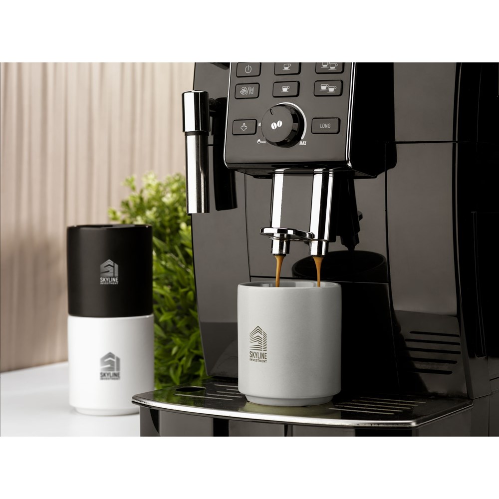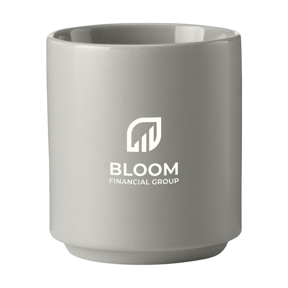 Stapelbare mok zonder oor, in een tijdloos design. Van hoogwaardig keramiek. Afgewerkt met een matte buitenzijde en hoogglans binnenzijde. Geschikt voor de meeste koffieapparaten. Vaatwasserbestendig. De opdruk is vaatwasmachine getest en gecertificeerd: EN 12875-2. Inhoud 200 ml. OPMERKING: De witte mok kan niet worden voorzien van een lasergravure omdat deze onvoldoende zichtbaar is.